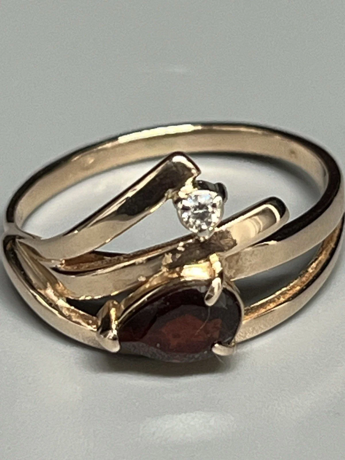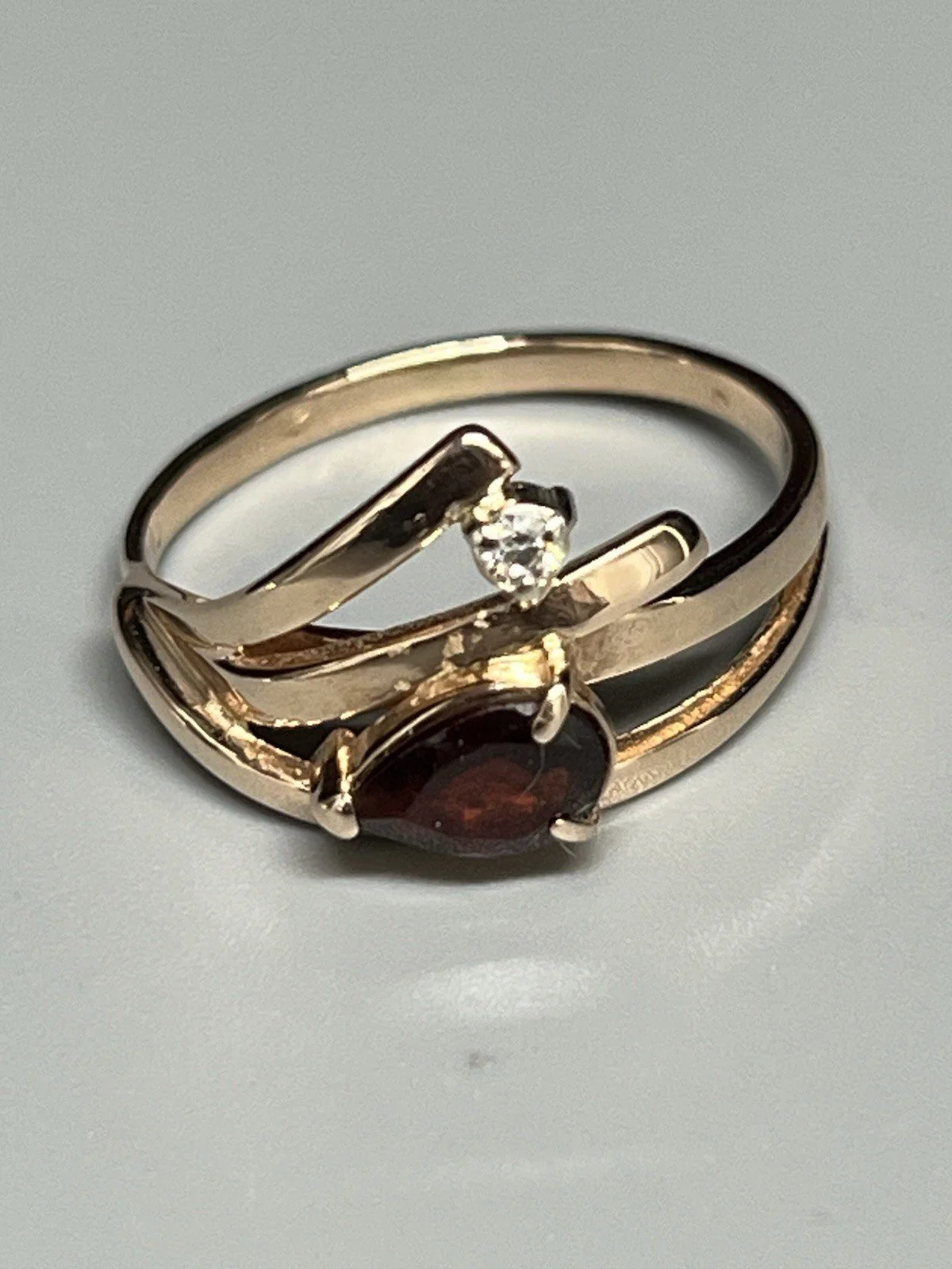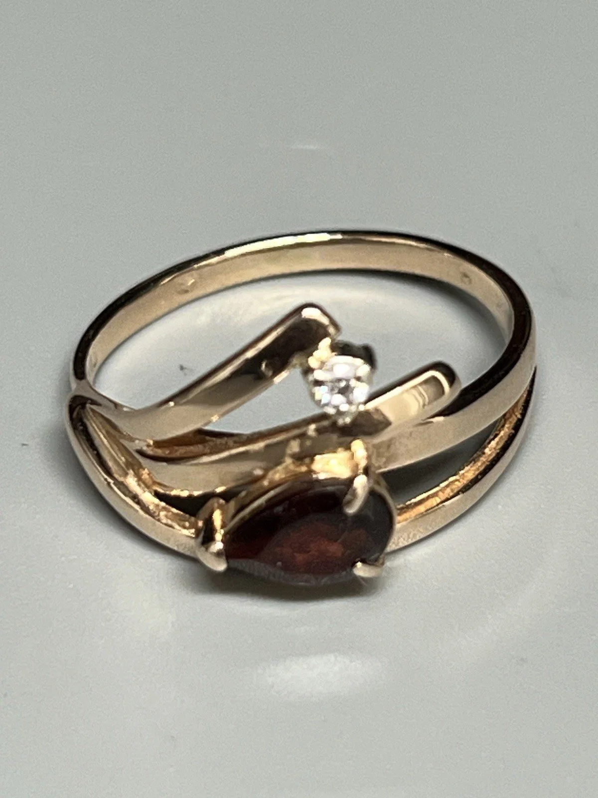 Ladies 14ct rose gold ring in a unique design incorporating a tear drop shaped garnet and a small round white cubic zirconia gemstone.