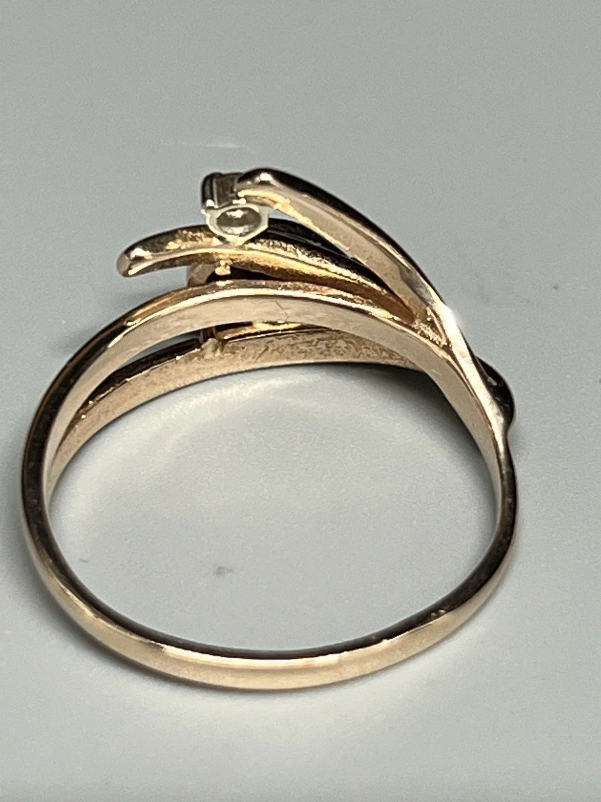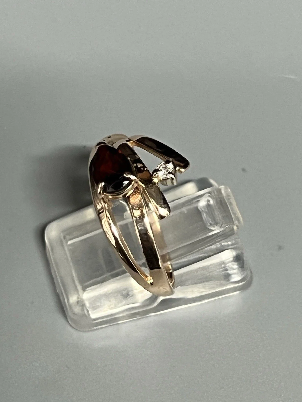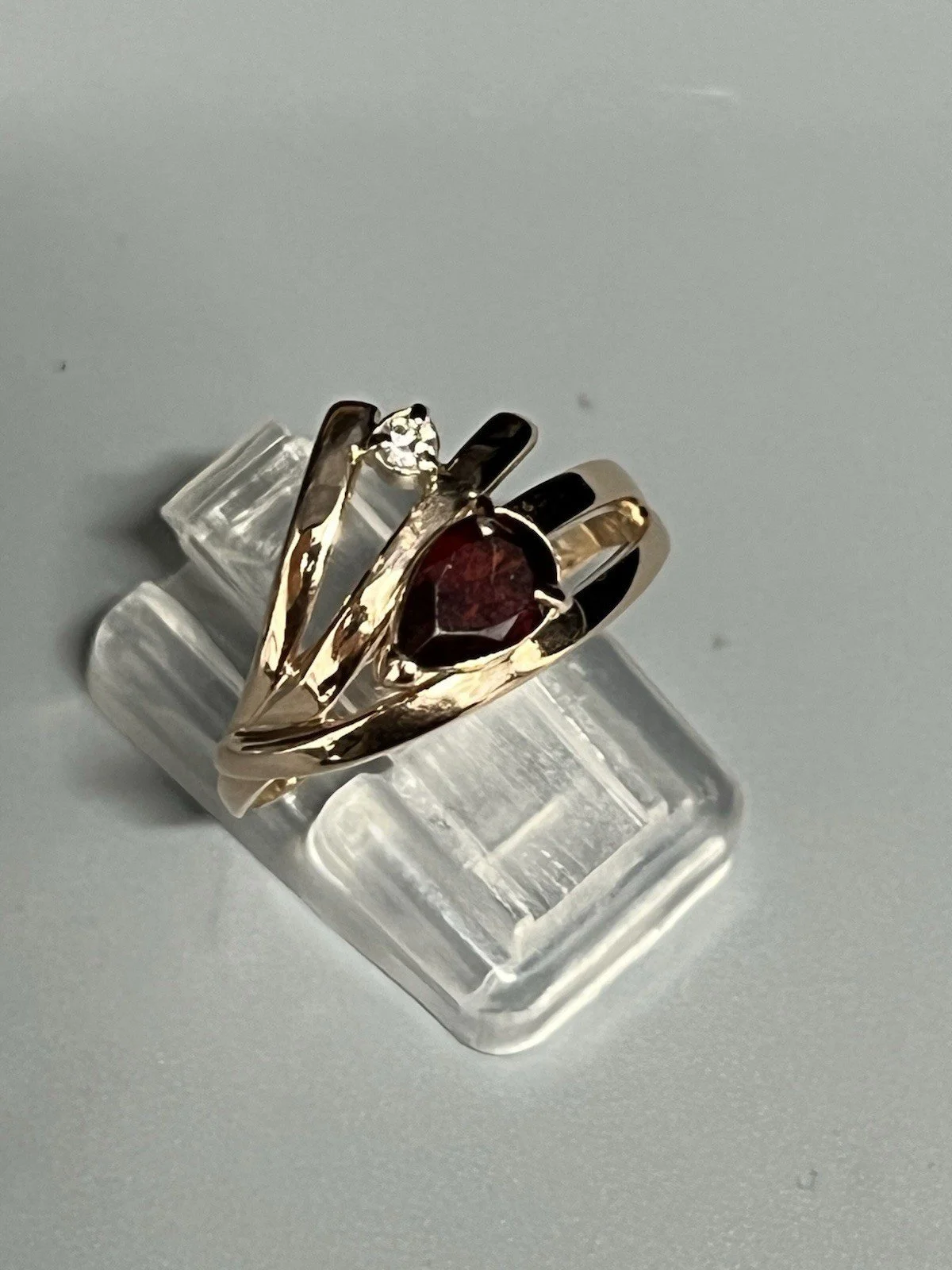 Ladies 14ct rose gold ring in a unique design incorporating a tear drop shaped garnet and a small round white cubic zirconia gemstone.