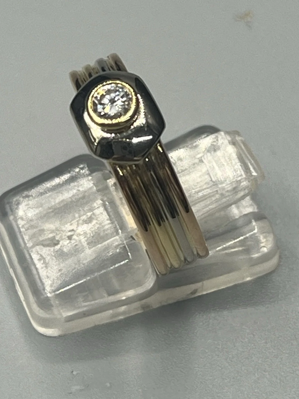 Ladies 18ct diamond solitaire ring consisting of 2 rows of rose gold. 2 yellow and 1 white gold making the band with a lovely white solitaire in centre.