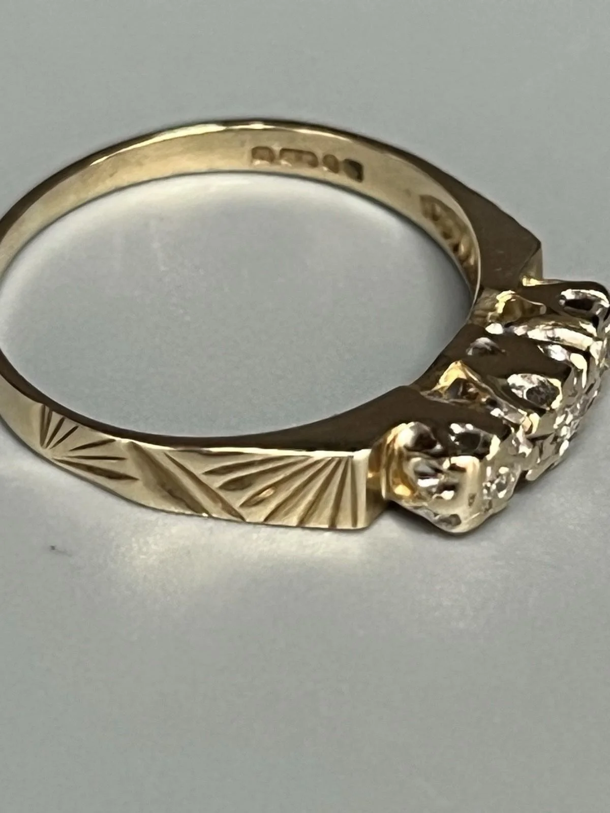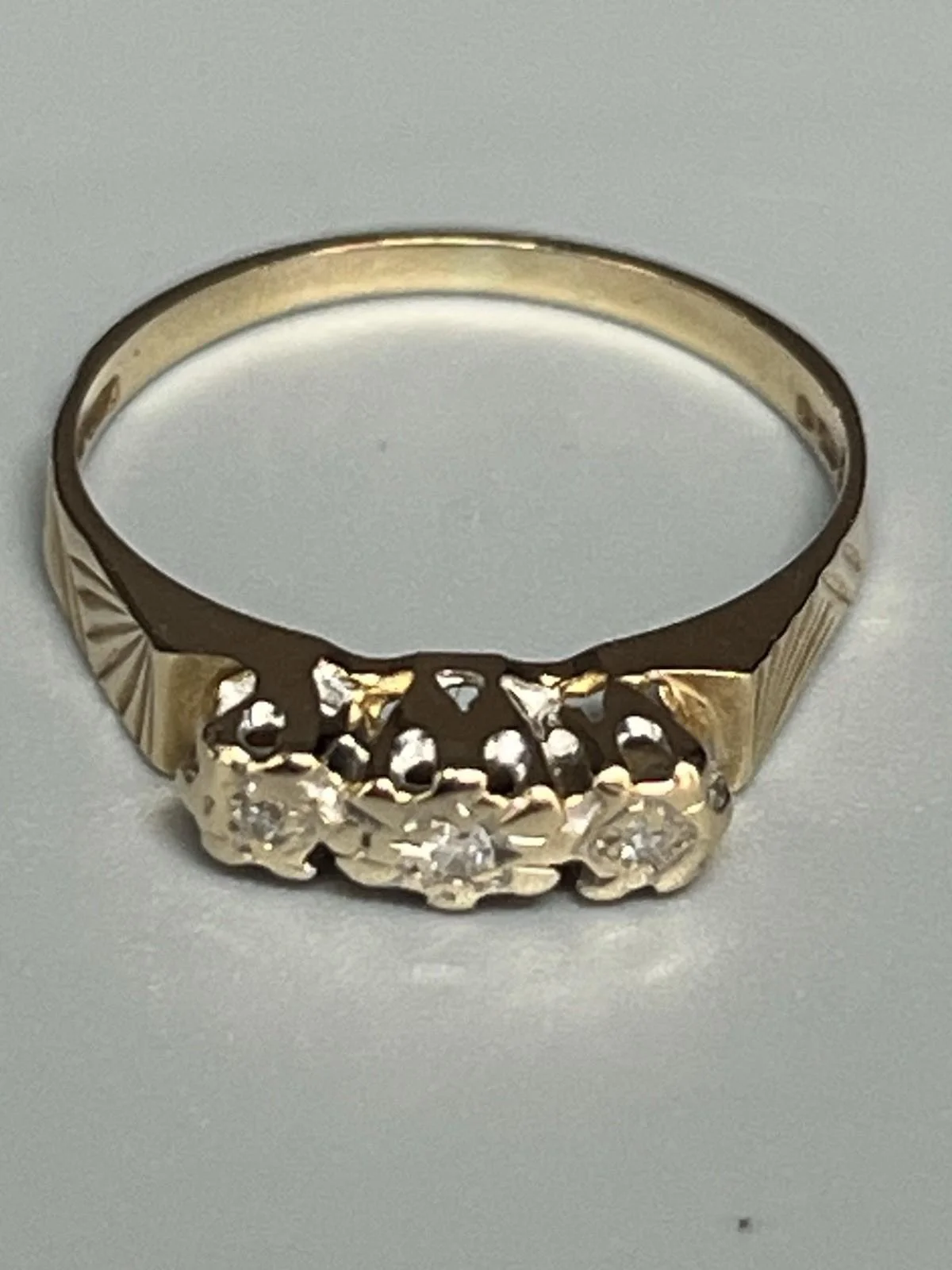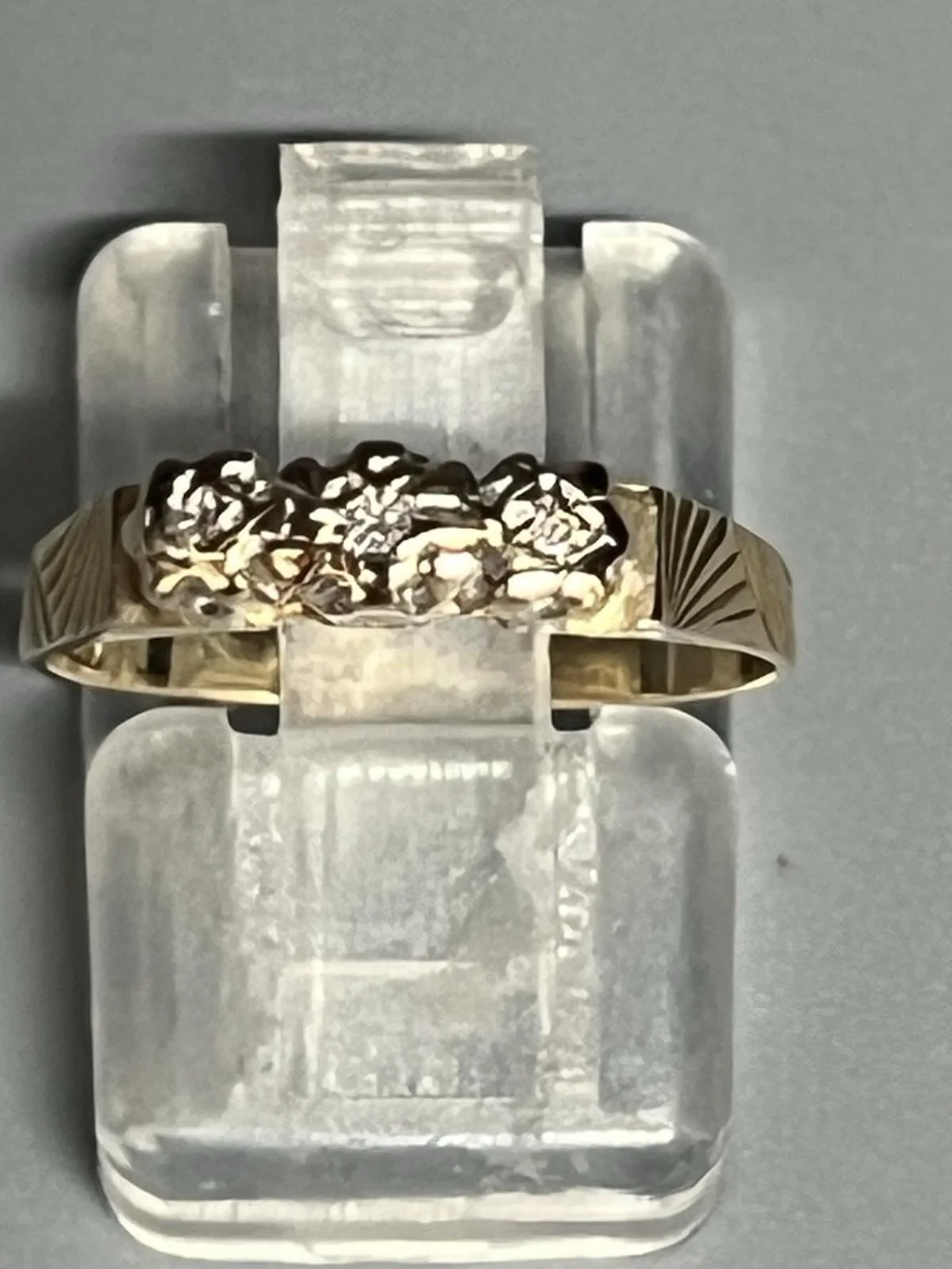 Ladies 9ct yellow gold ring with 3 small white cubic zirconia gemstones.
