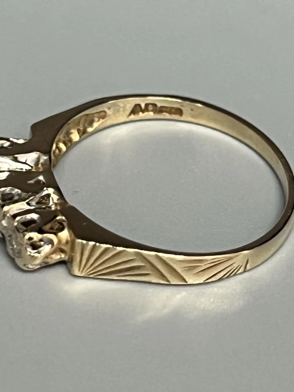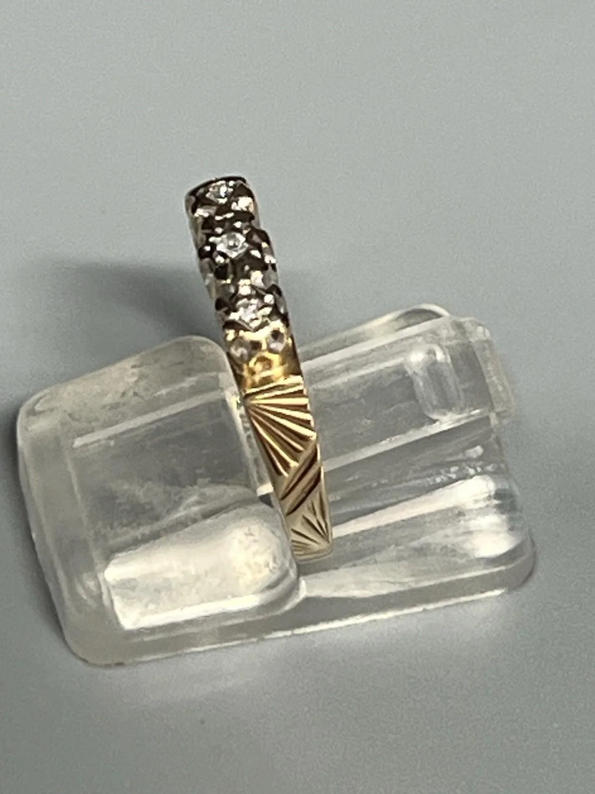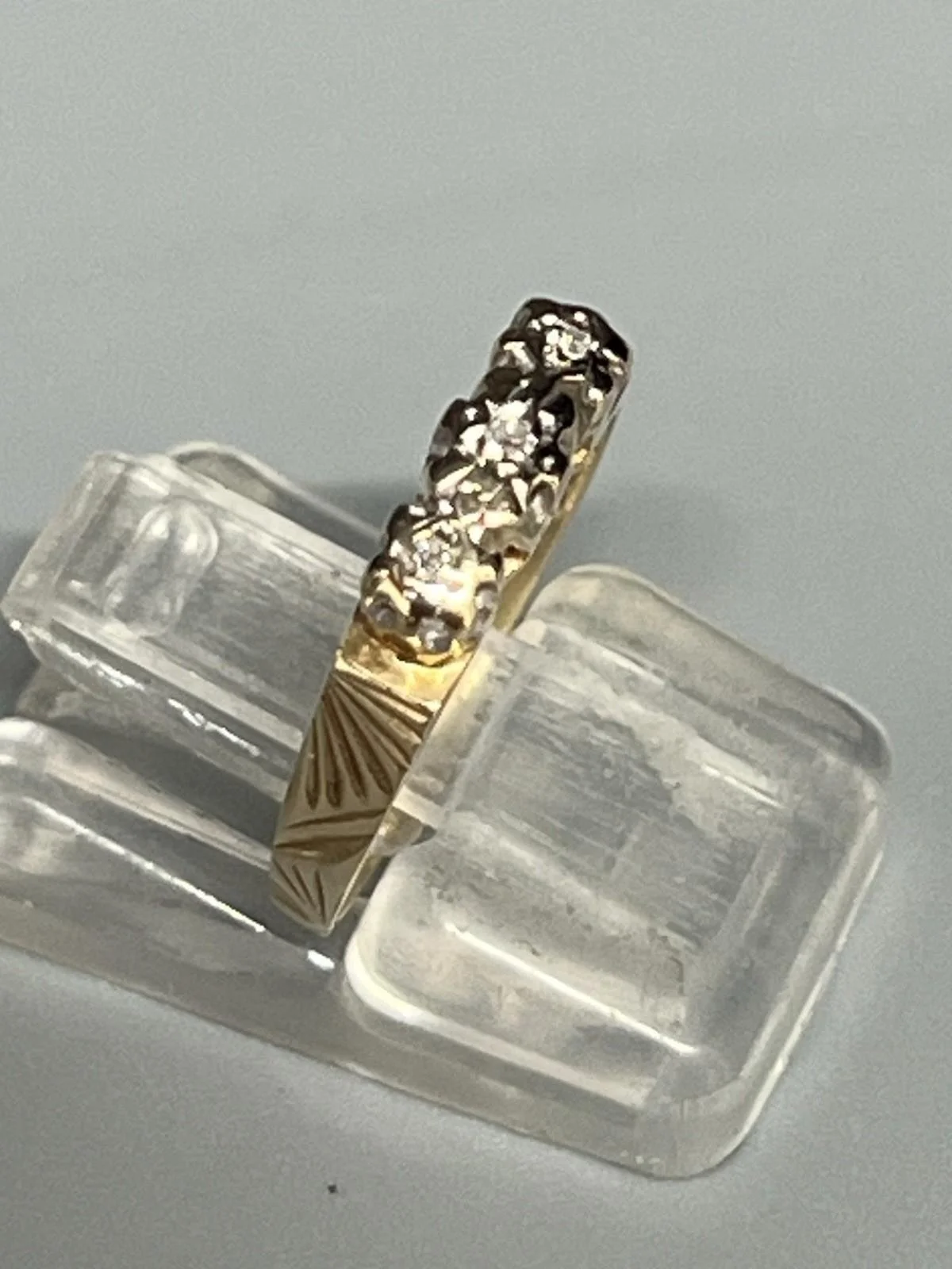 Ladies 9ct yellow gold ring with 3 small white cubic zirconia gemstones.