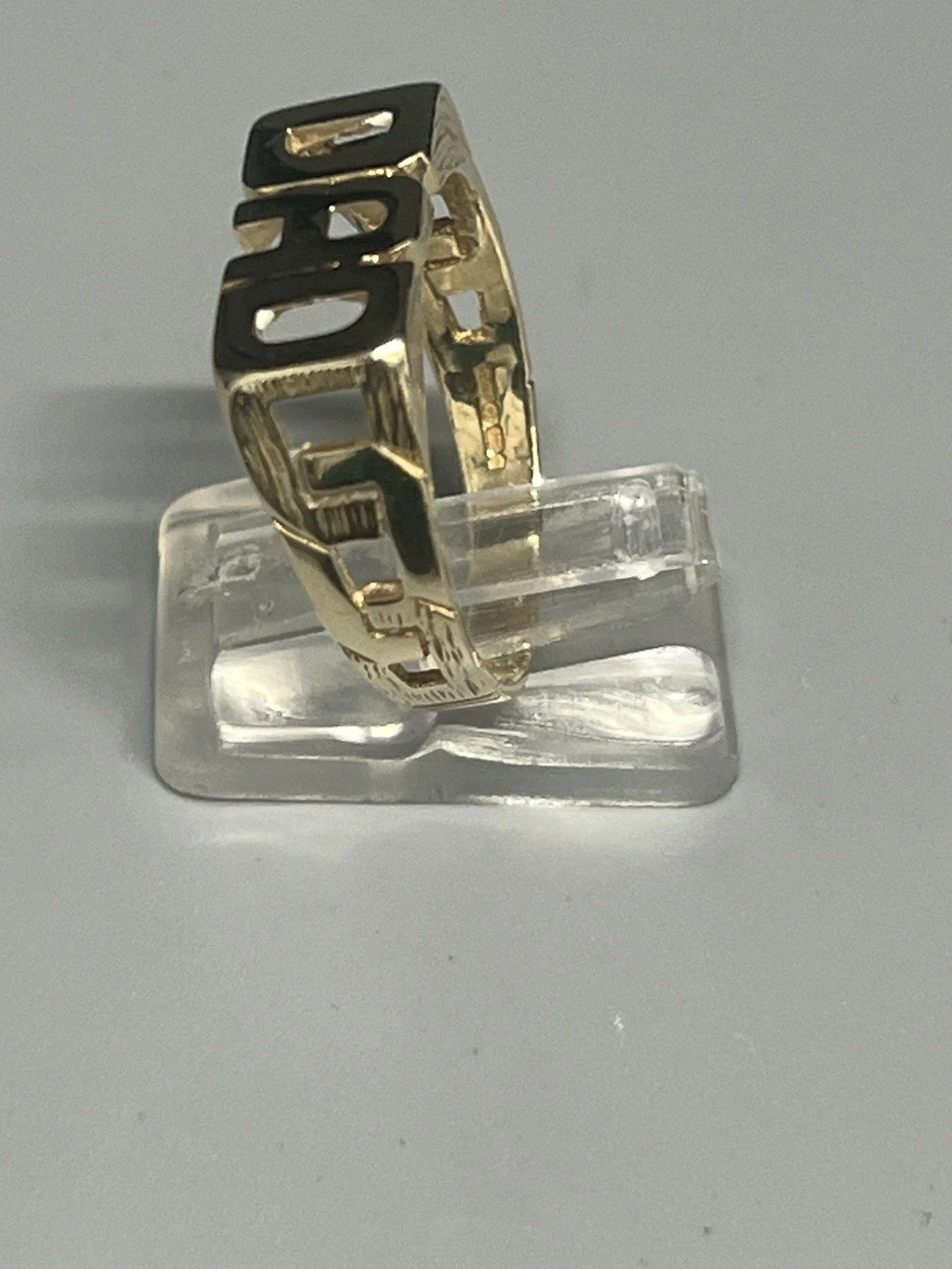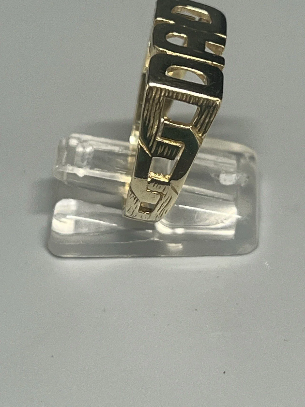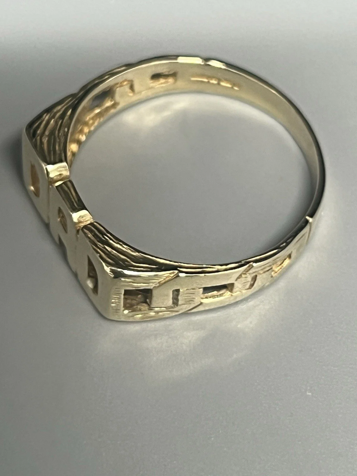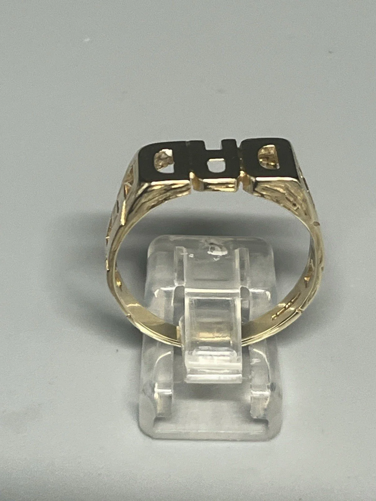 SHOP › 9CT GOLD DAD RING Image 1 of 7 Image 2 of 7 Image 3 of 7 Image 4 of 7 Image 5 of 7 Image 6 of 7 Image 7 of 7 9CT GOLD DAD RING £230.00 9CT GOLD DAD RING 9ct gold dad ring weight 3.9g ring size X chain pattern down sides of ring width at widest part approx 10mm fully hallmarked Item Number D948 Add To Cart Added! 9CT GOLD DAD RING 9ct gold dad ring weight 3.9g ring size X chain pattern down sides of ring width at widest part approx 10mm fully hallmarked Item Number D948