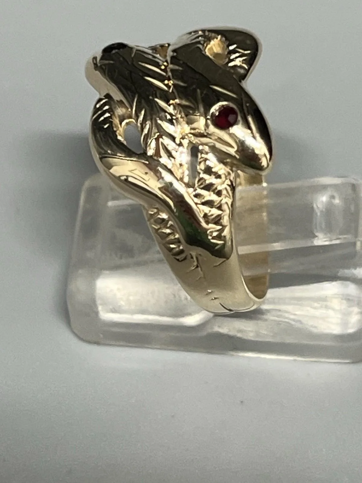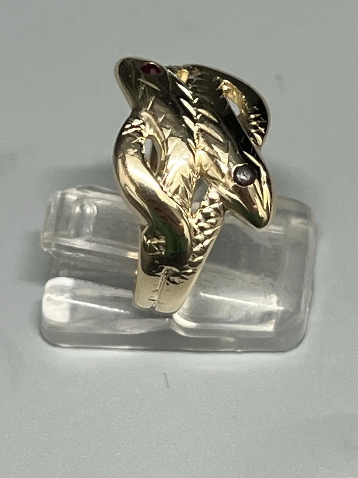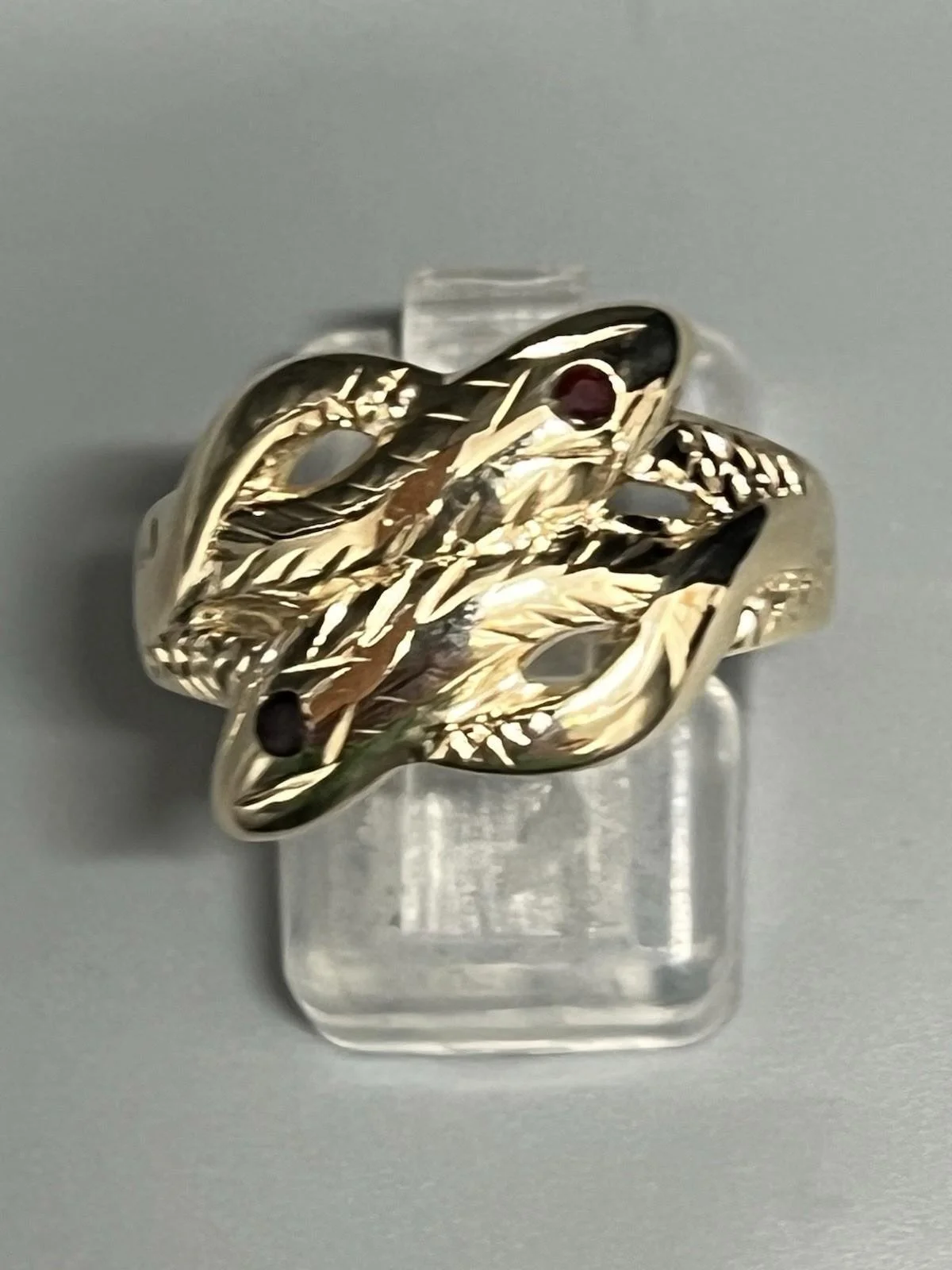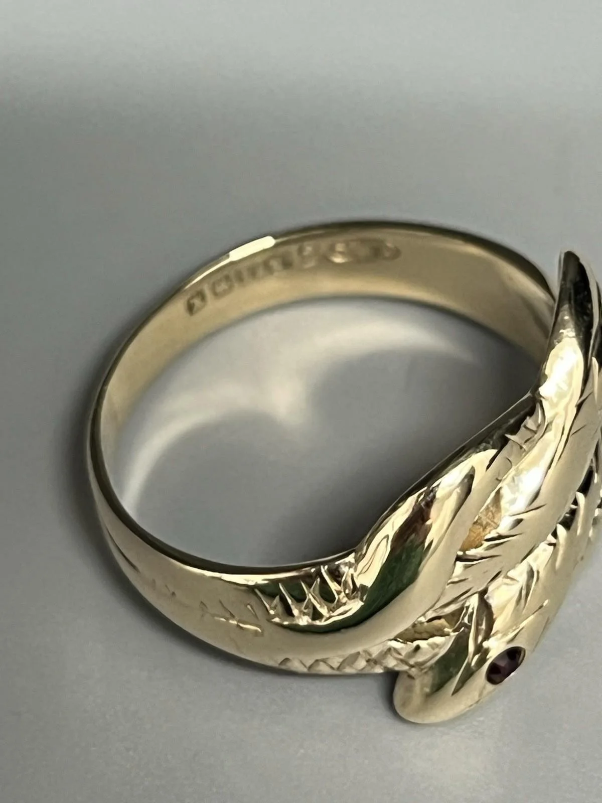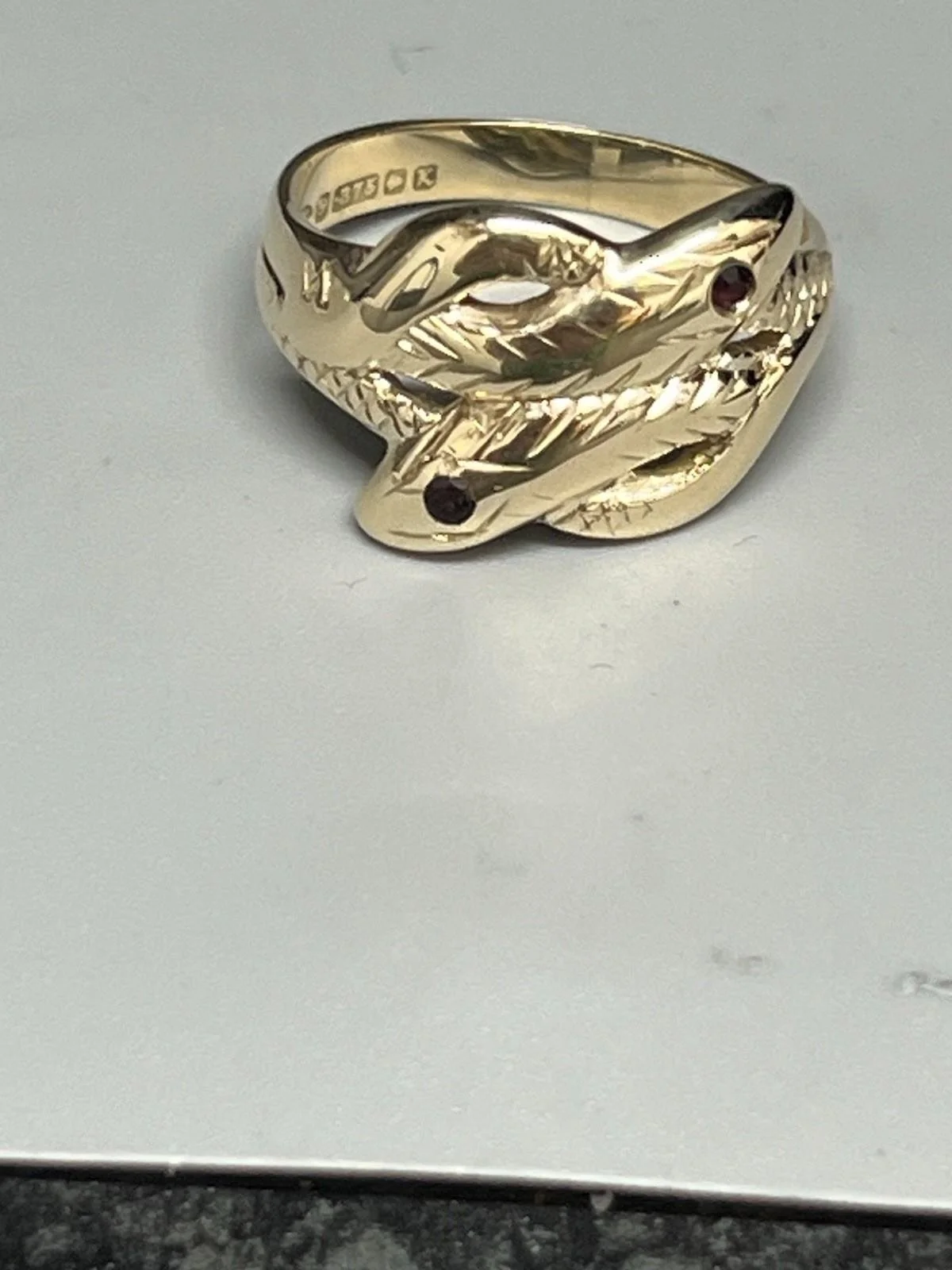 SHOP › 9CT GOLD GENTS ENTWINED SNAKE RING Image 1 of 5 Image 2 of 5 Image 3 of 5 Image 4 of 5 Image 5 of 5 9CT GOLD GENTS ENTWINED SNAKE RING £320.00 9CT GOLD GENTS ENTWINED SNAKE RING 9ct gold gents entwined snake ring 2 snakes entwined with black eyes weight 5.2g size S width approx 13mm fully hallmarked Item Number C1999 Add To Cart Added! 9CT GOLD GENTS ENTWINED SNAKE RING 9ct gold gents entwined snake ring 2 snakes entwined with black eyes weight 5.2g size S width approx 13mm fully hallmarked Item Number C1999