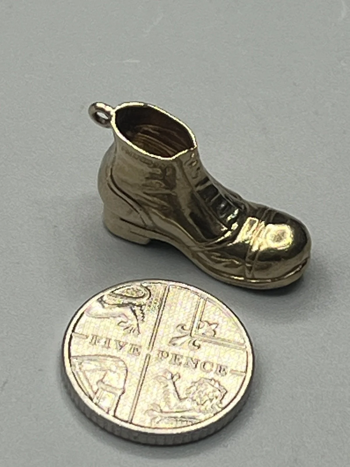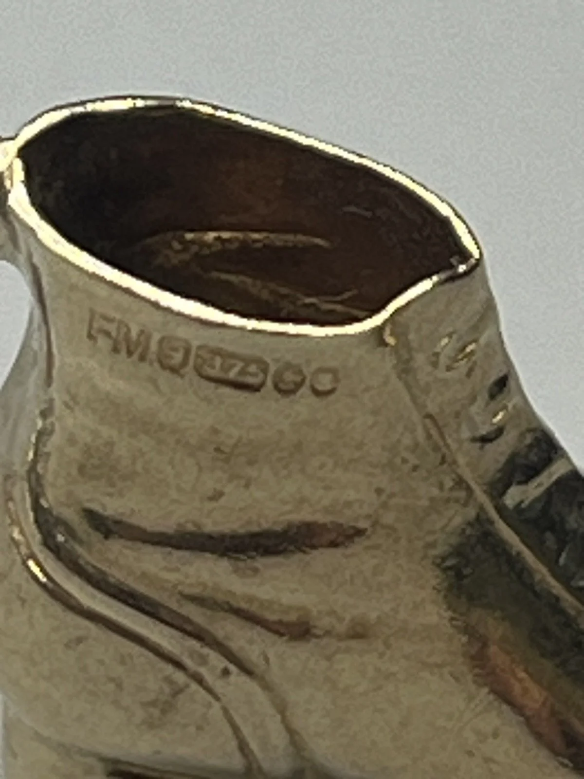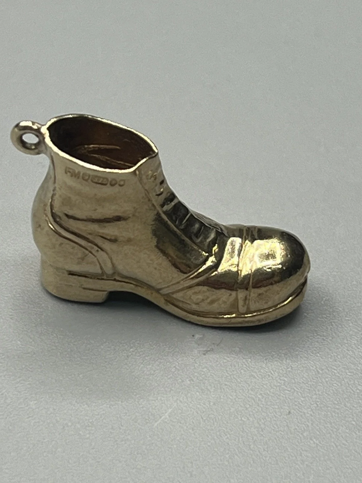 SHOP › 9CT GOLD OLD BOOT CHARM Image 1 of 6 Image 2 of 6 Image 3 of 6 Image 4 of 6 Image 5 of 6 Image 6 of 6 9CT GOLD OLD BOOT CHARM £85.00 9CT GOLD OLD BOOT CHARM 9ct gold old boot charm weight 1.5g height approx 15mm width approx 20mm full hallmark item number 334 Add To Cart Added! 9CT GOLD OLD BOOT CHARM 9ct gold old boot charm weight 1.5g height approx 15mm width approx 20mm full hallmark item number 334