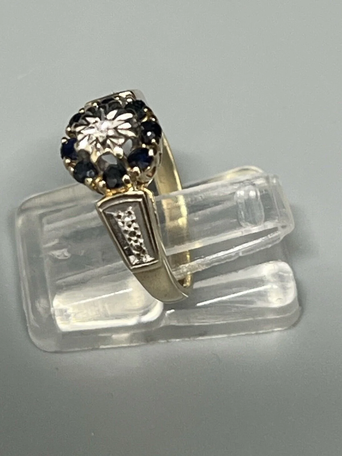 SHOP › 9CT GOLD SAPPHIRE & DIAMOND RING Image 1 of 6 Image 2 of 6 Image 3 of 6 Image 4 of 6 Image 5 of 6 Image 6 of 6 9CT GOLD SAPPHIRE & DIAMOND RING £175.00 9ct GOLD SAPPHIRE & DIAMOND RING Ladies 9ct sapphire and diamond cluster ring . 8 blue sapphires and 3 small diamonds ( 1 in centre and 1 on each shoulder. in size J Weight 2.6g Width approx 8mm Item Number B571 Add To Cart Added! 9ct GOLD SAPPHIRE & DIAMOND RING Ladies 9ct sapphire and diamond cluster ring . 8 blue sapphires and 3 small diamonds ( 1 in centre and 1 on each shoulder. in size J Weight 2.6g Width approx 8mm Item Number B571
