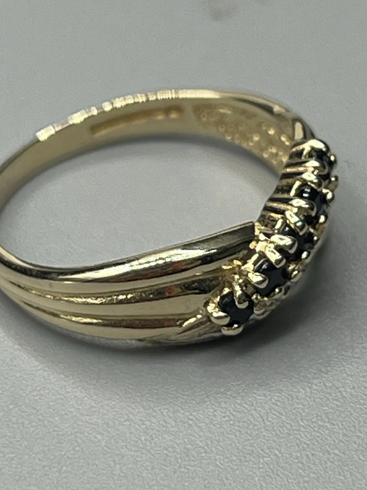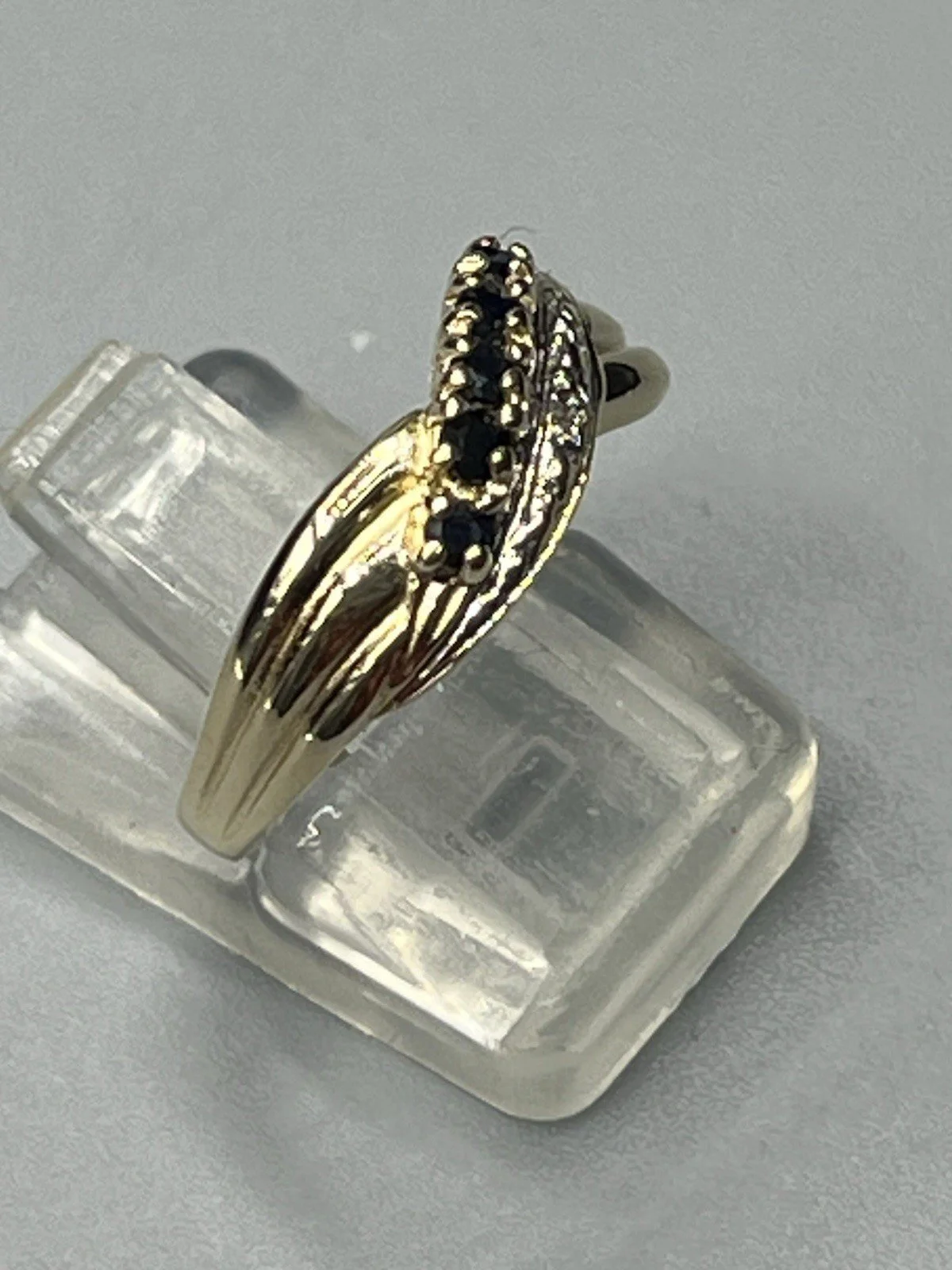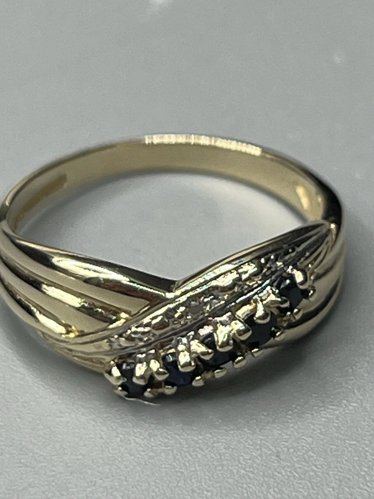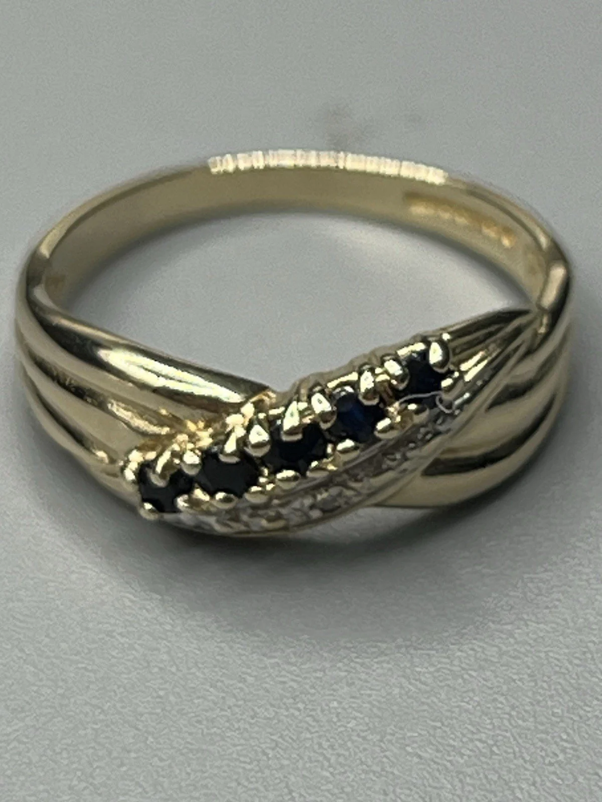 Ladies 9ct yellow gold crossover style ring consisting of 5 small sapphire gemstones and 1 small white diamond that is in a white gold setting.