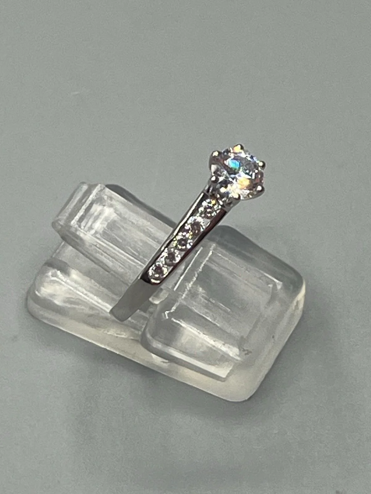 Ladies 9ct white gold solitaire with accents, incorporating a 4mm white cubic zirconia gemstone in centre with 5 smaller white white stones either side.