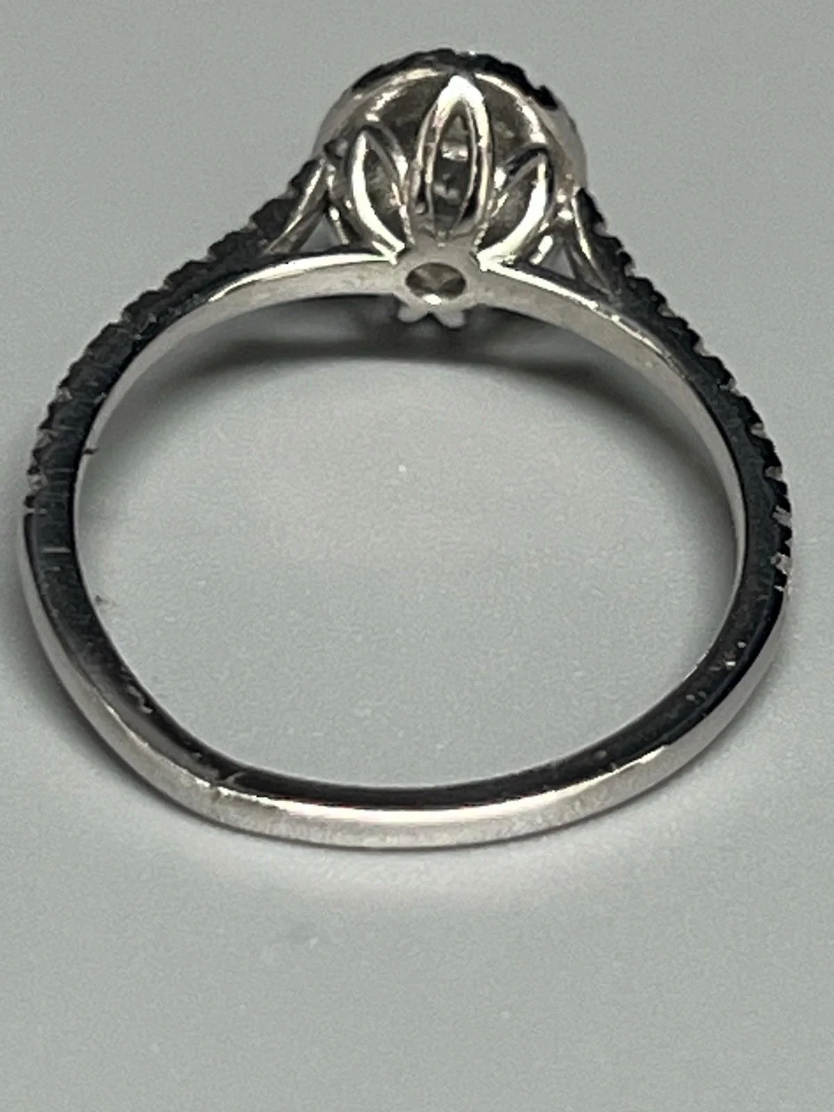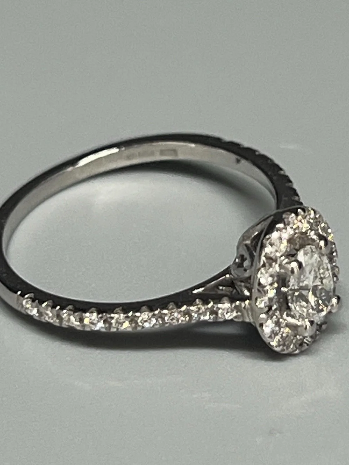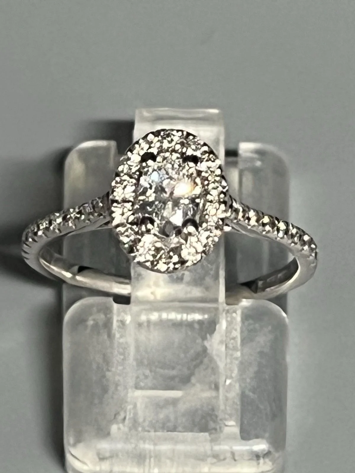 Ladies 9ct white gold diamond halo ring , Oval main stone with 14 small round white diamonds around outside and a further 9 diamonds on each shoulder.
