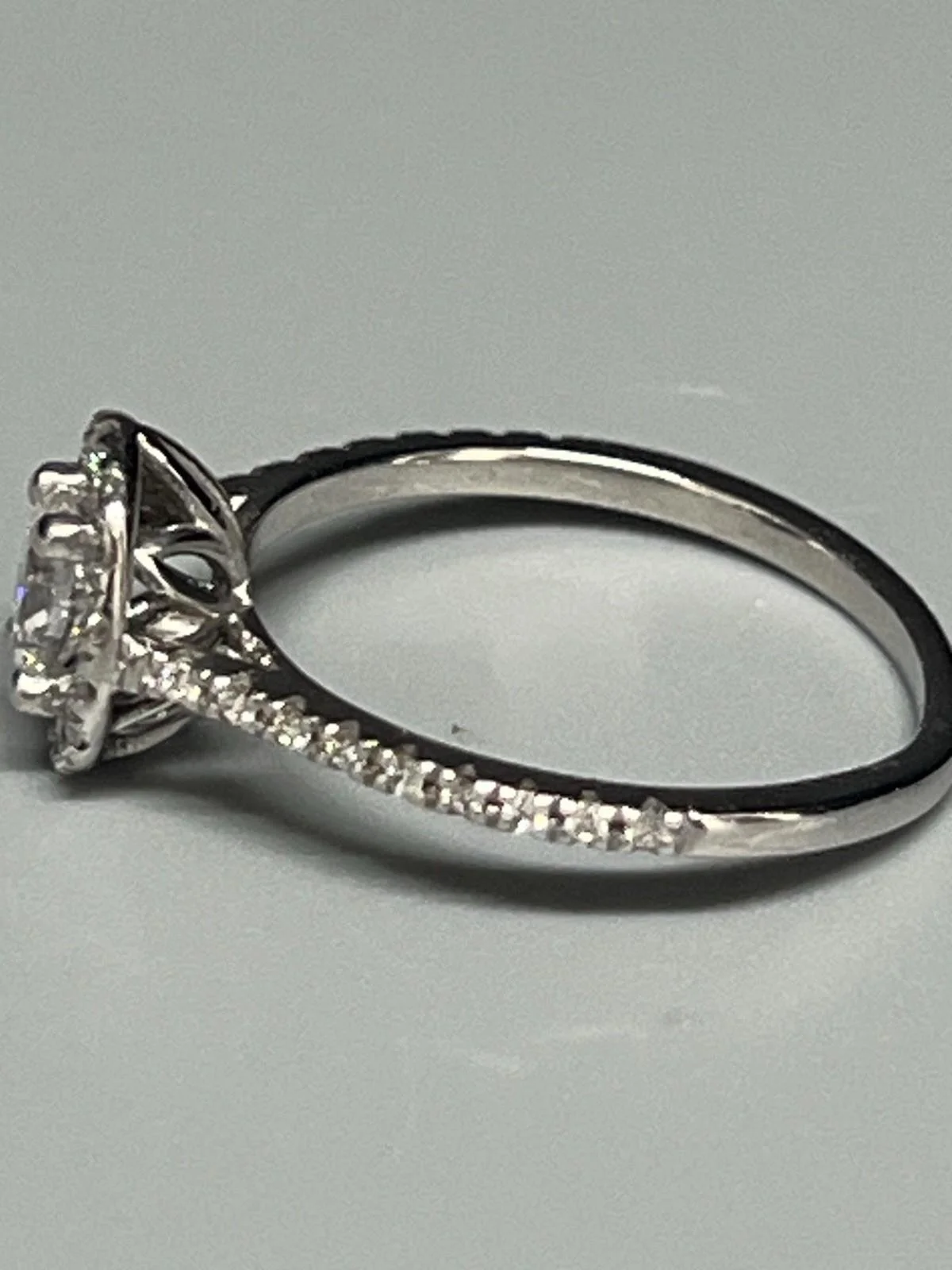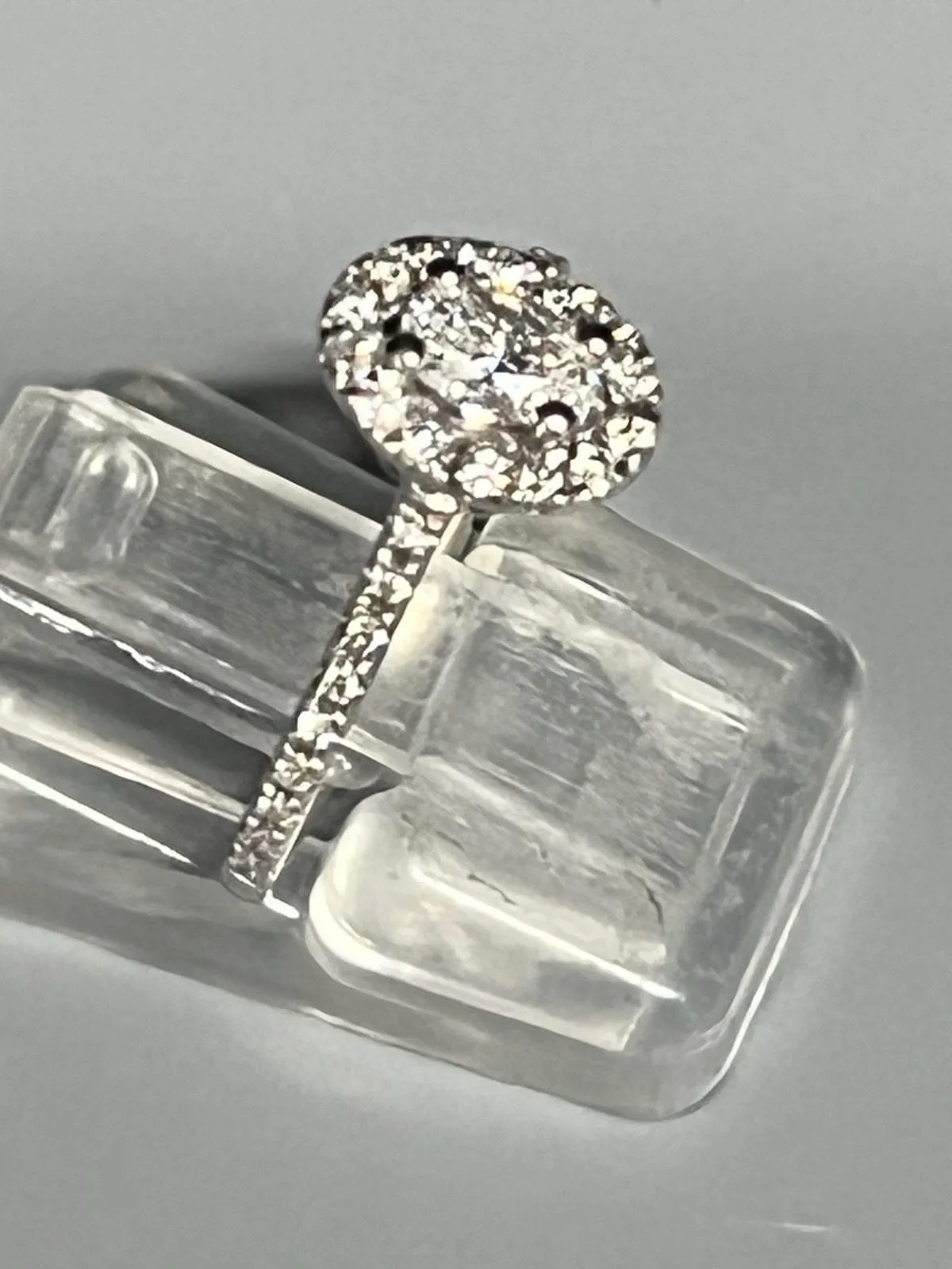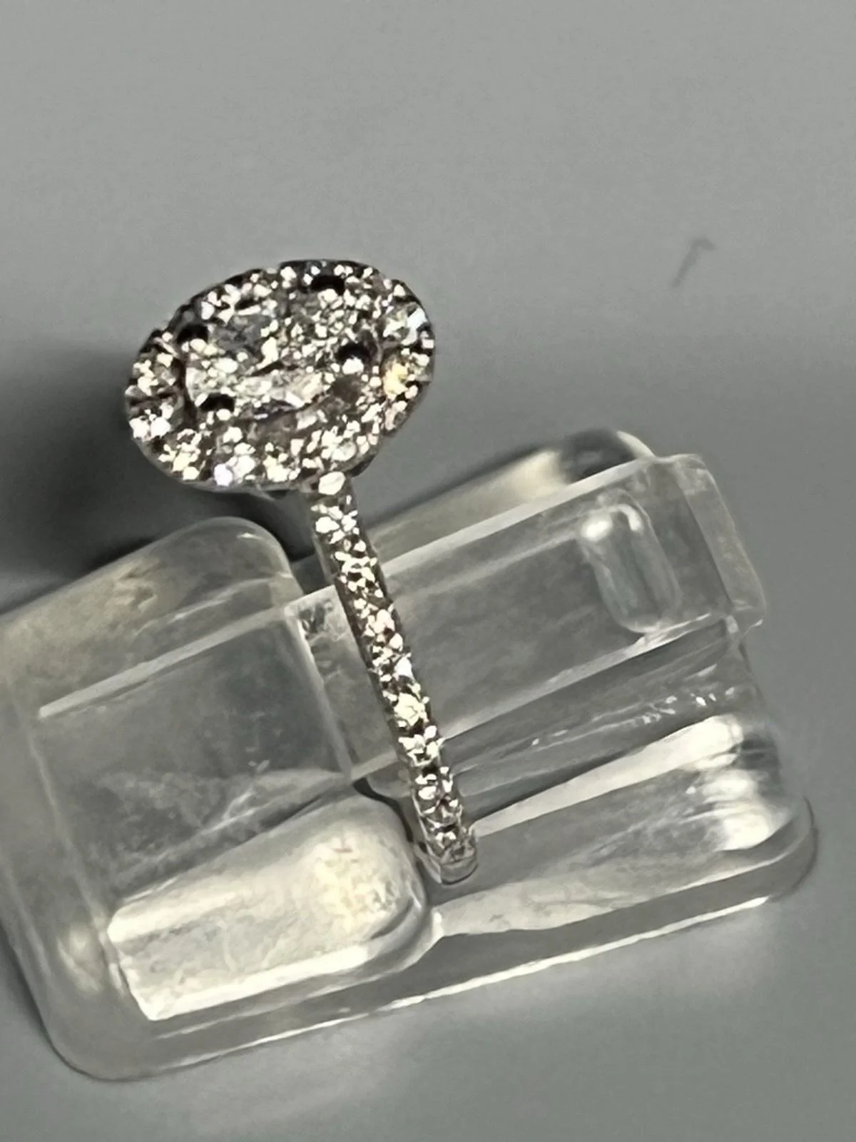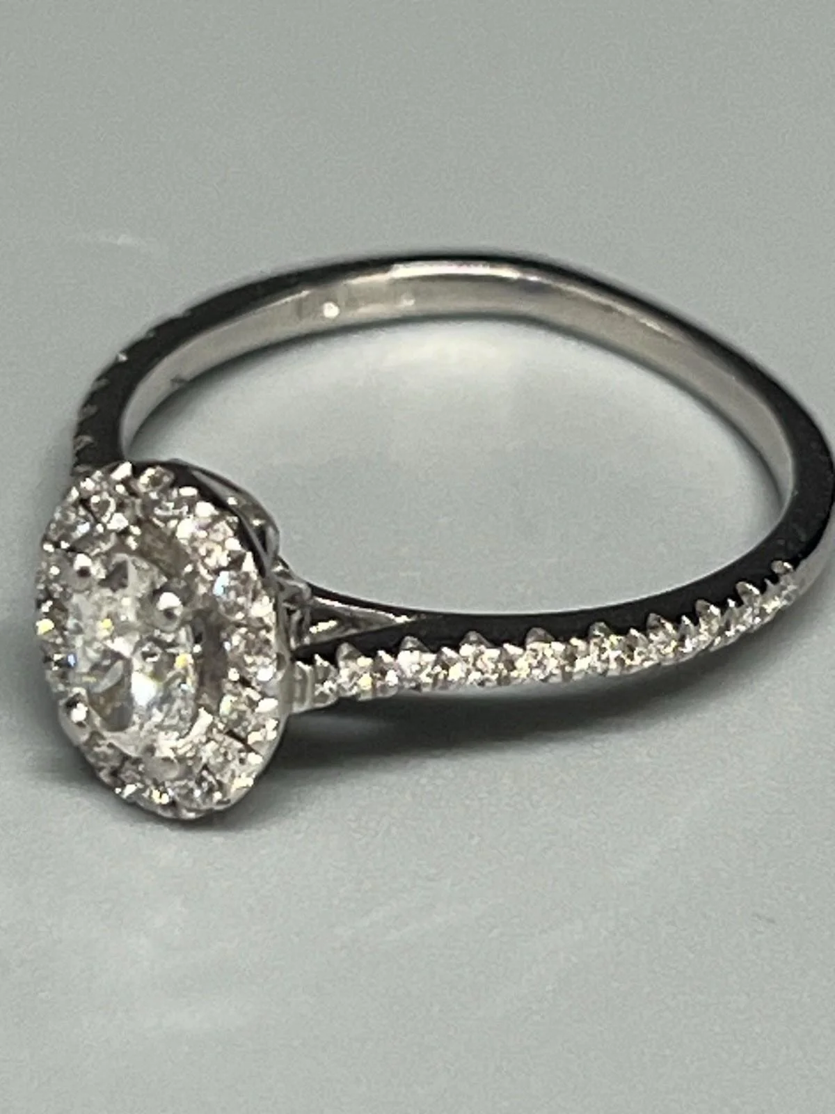Ladies 9ct white gold diamond halo ring , Oval main stone with 14 small round white diamonds around outside and a further 9 diamonds on each shoulder.
