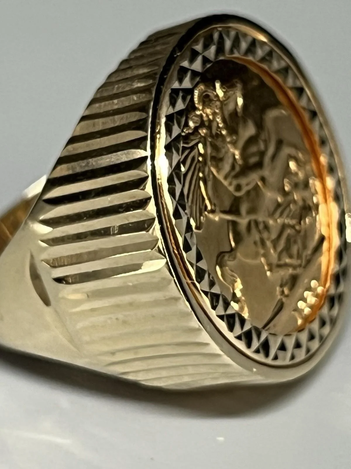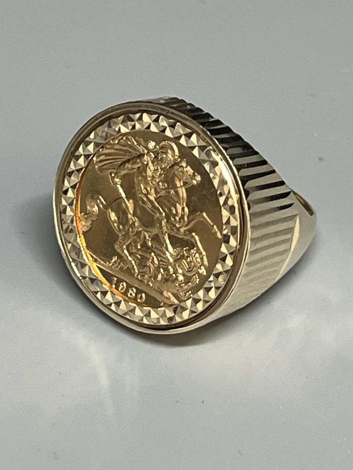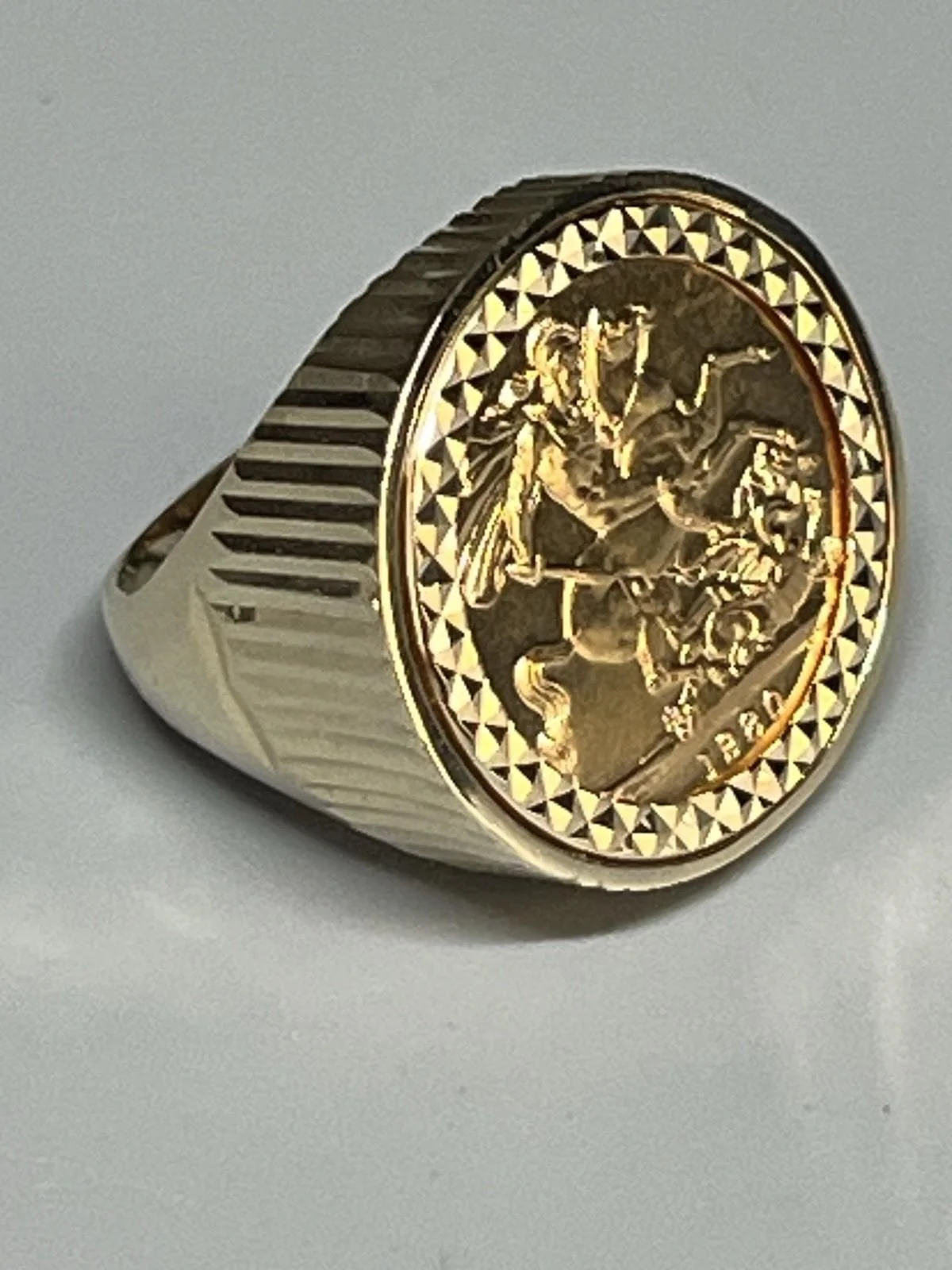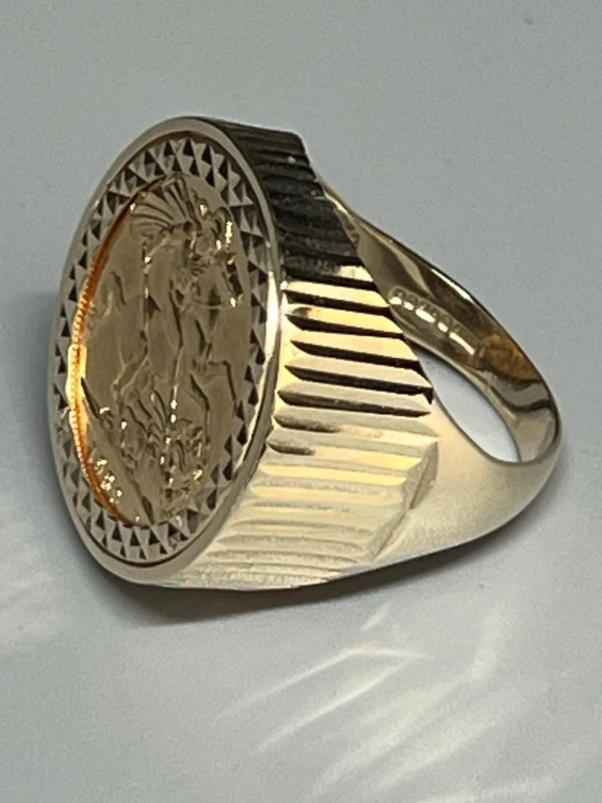 mount of ring is 9ct gold with ridged patterned sides, sovereign is 22ct gold