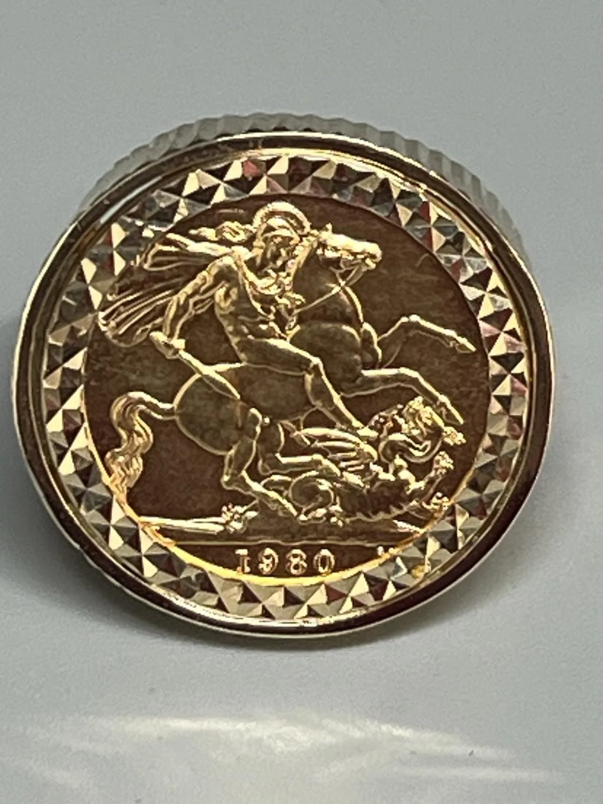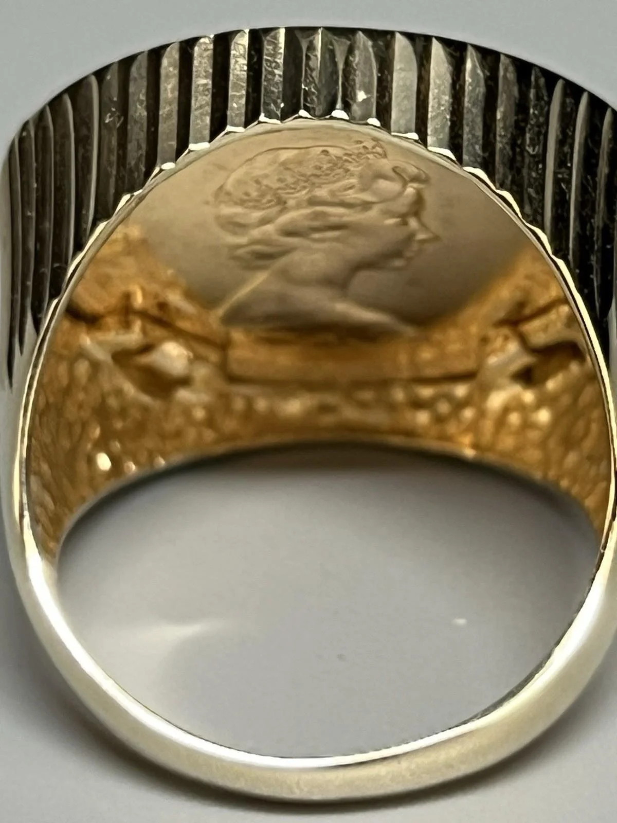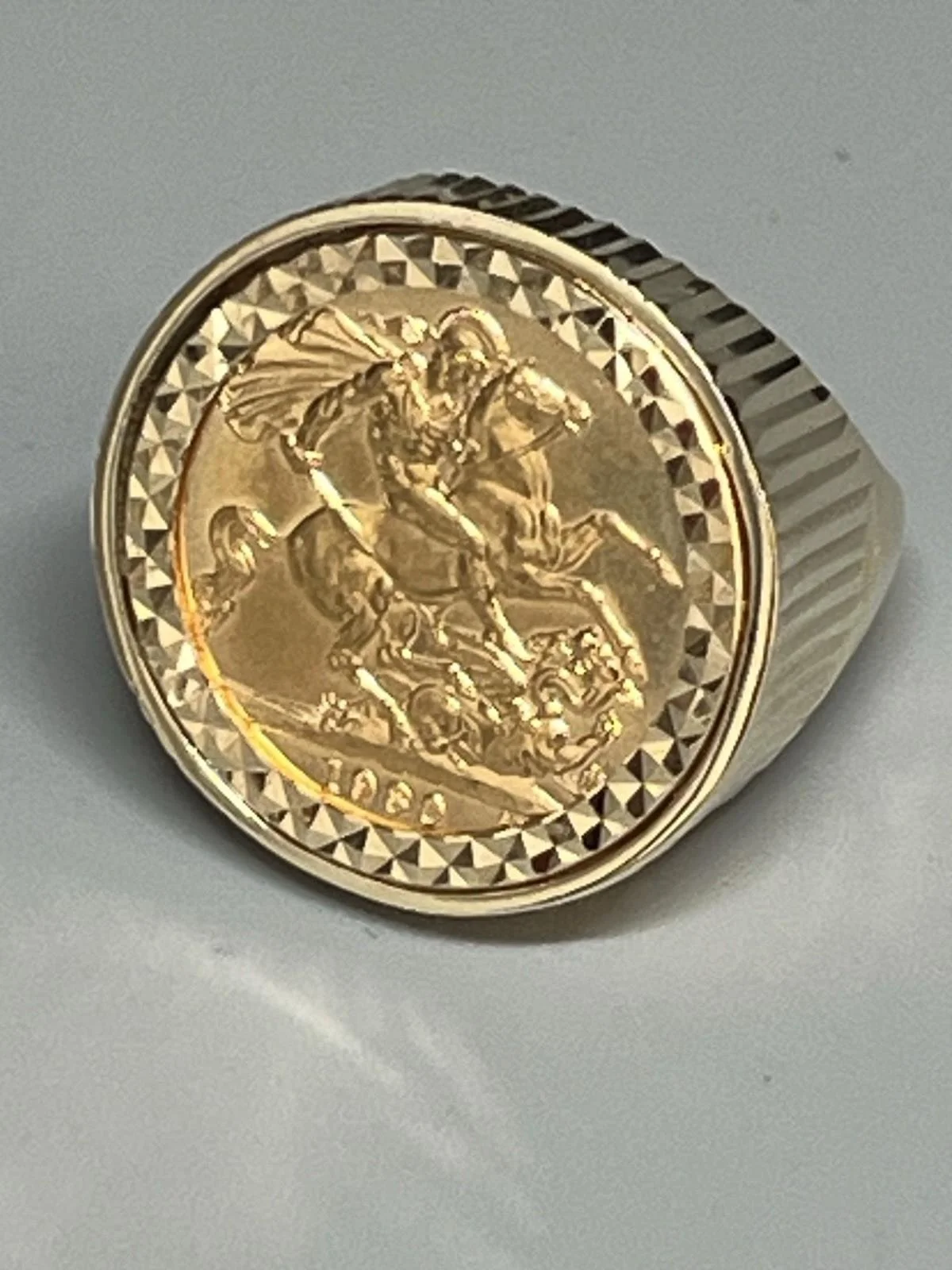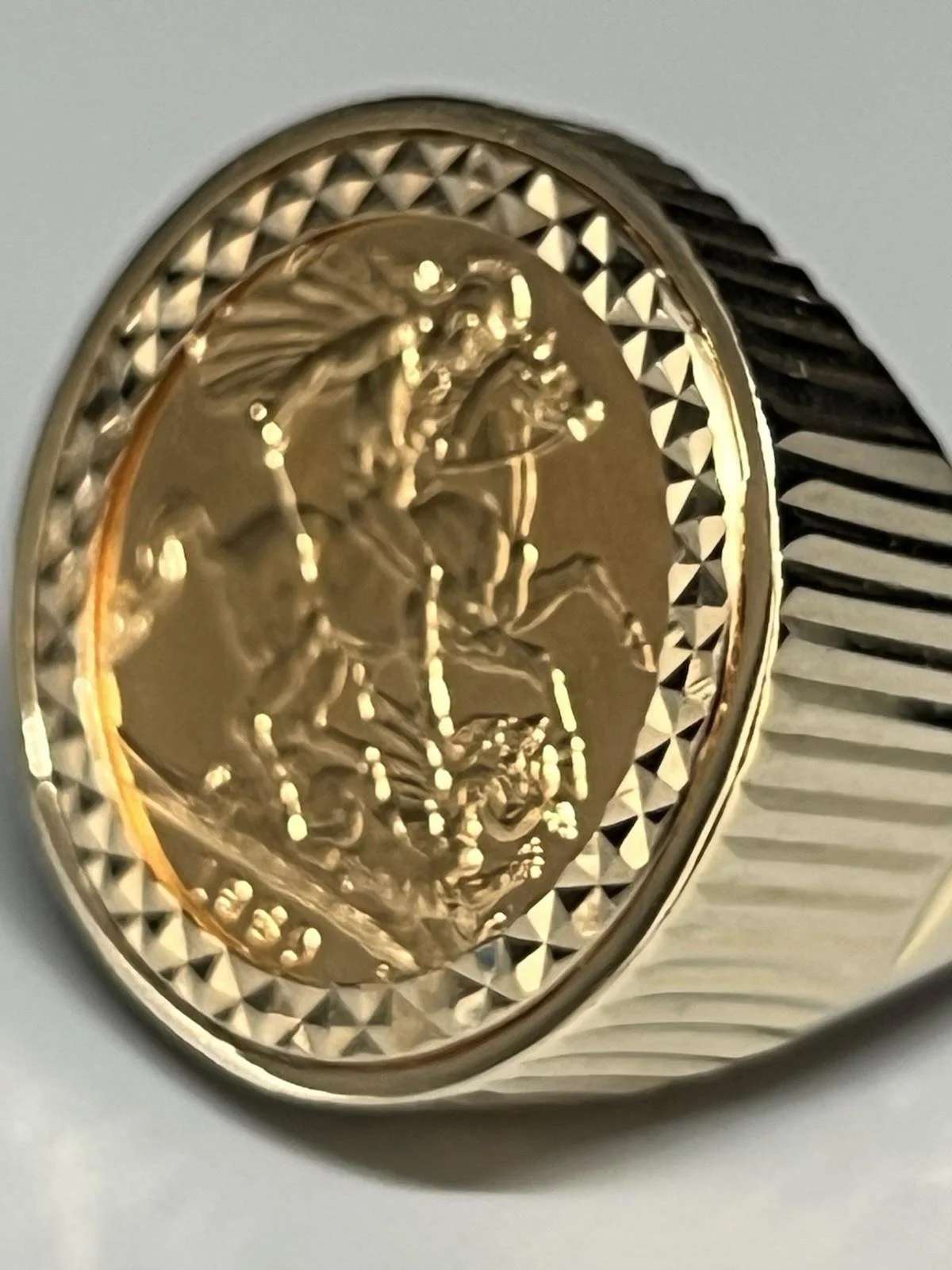 mount of ring is 9ct gold with ridged patterned sides, sovereign is 22ct gold