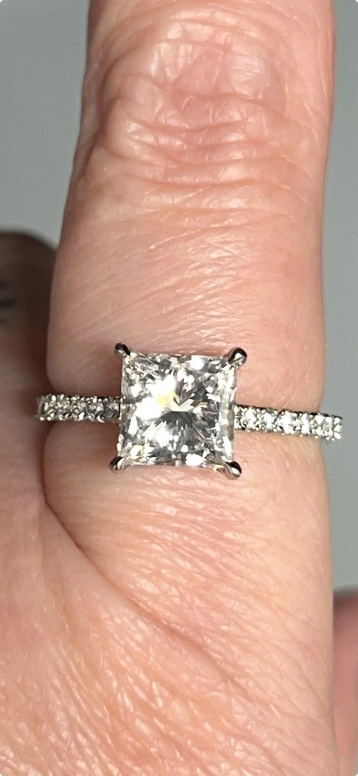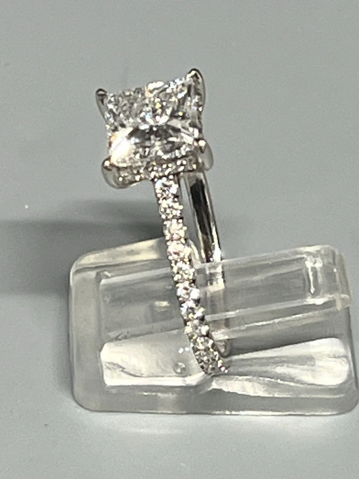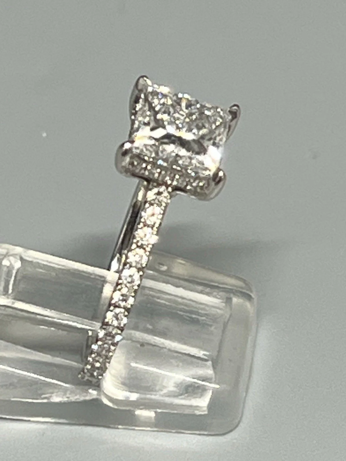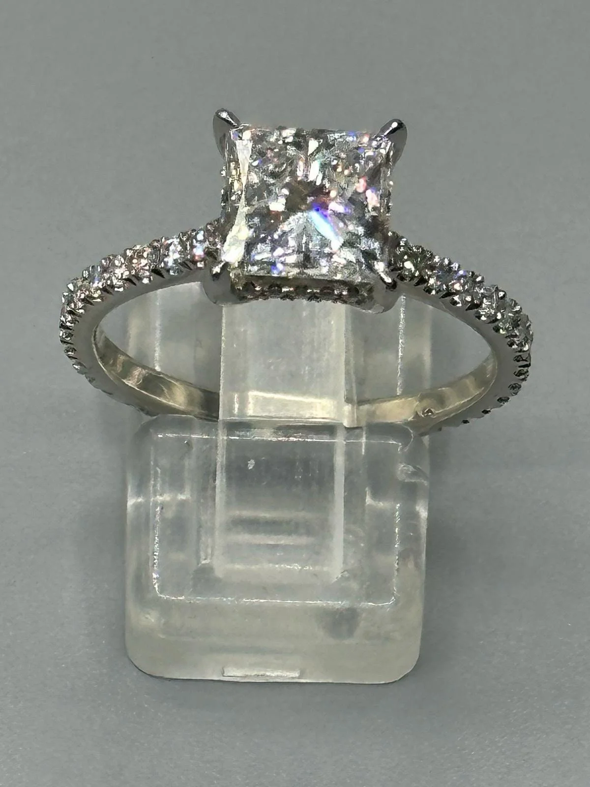 Stunning ring consisting of a 2.5ct princess cut lab diamond with 0.50ct diamond accents on the shoulders,