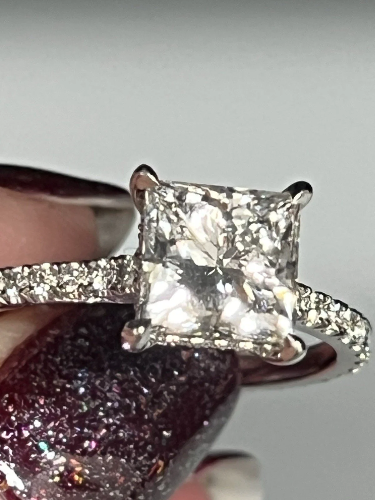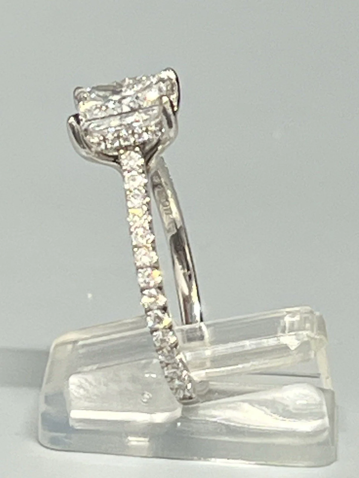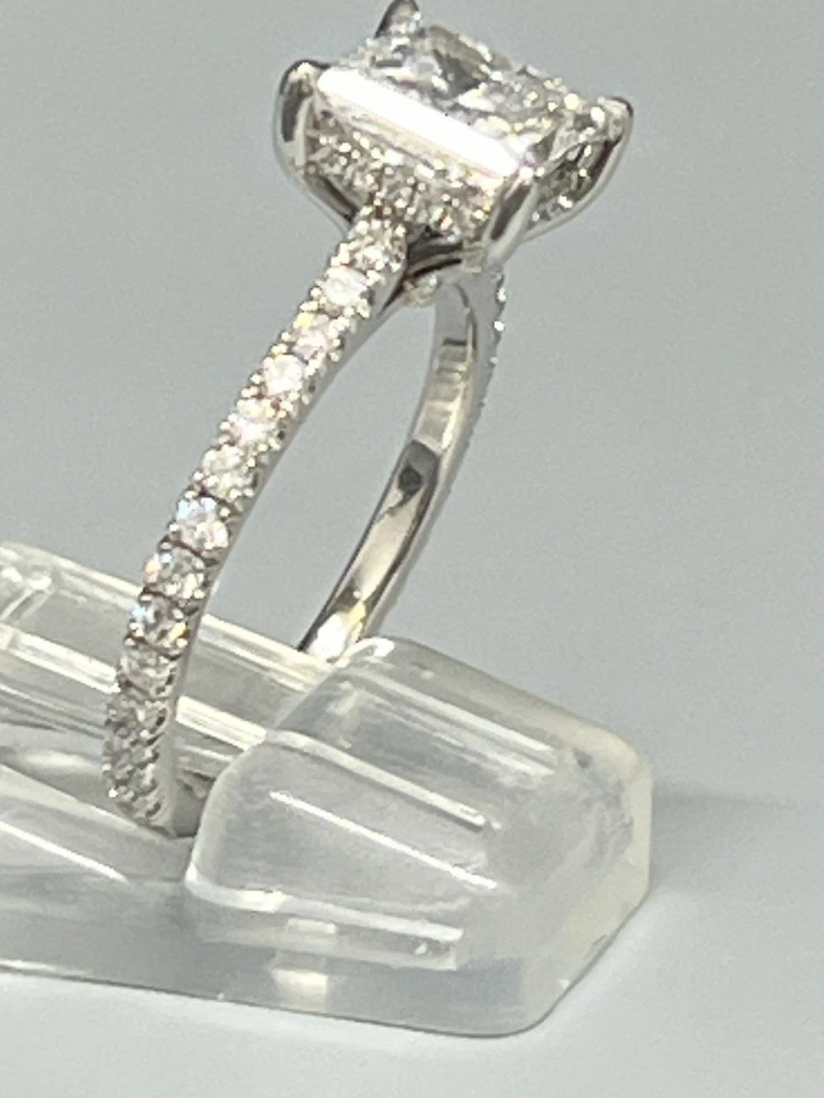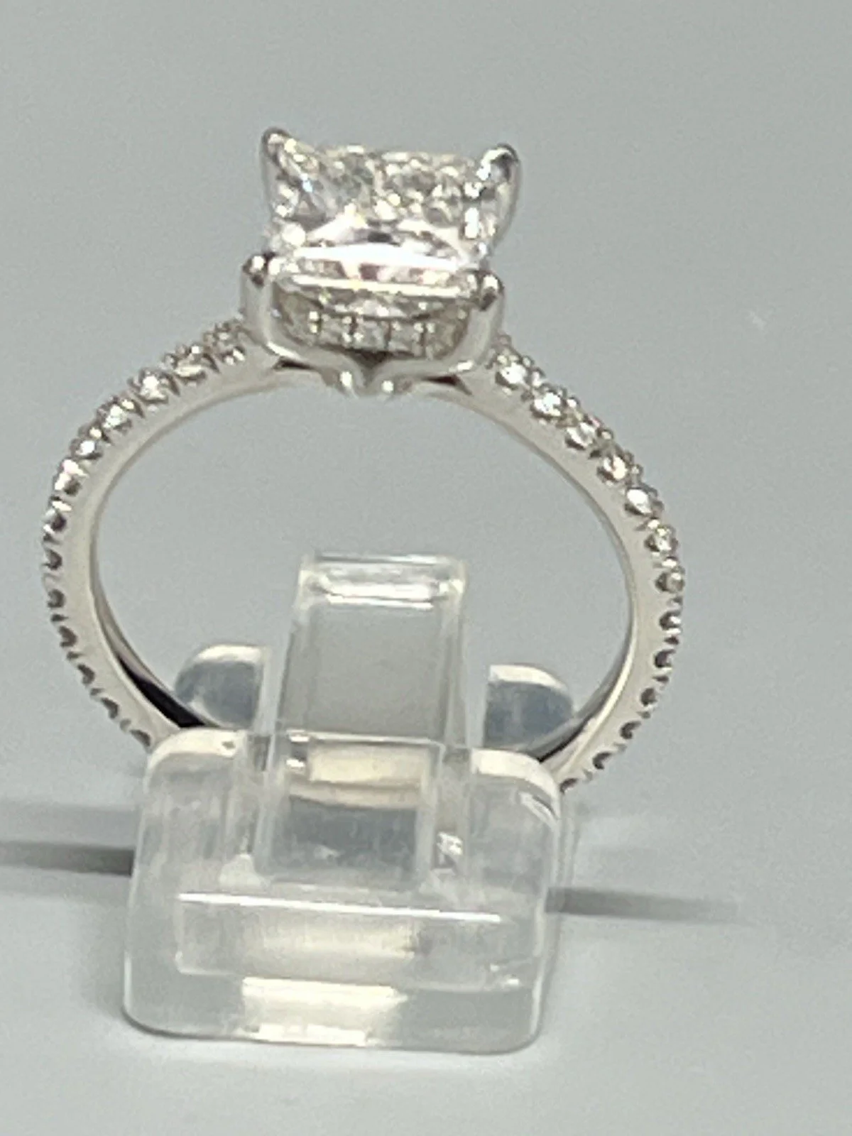Stunning ring consisting of a 2.5ct princess cut lab diamond with 0.50ct diamond accents on the shoulders,